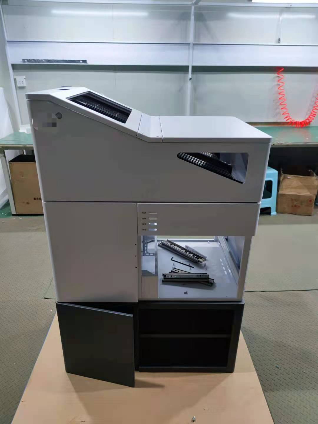這臺樣機總共400多個零件加工組裝完成,充分的體現了我們鈑金加工廠的加工工藝成熟,配套齊全,穩定。